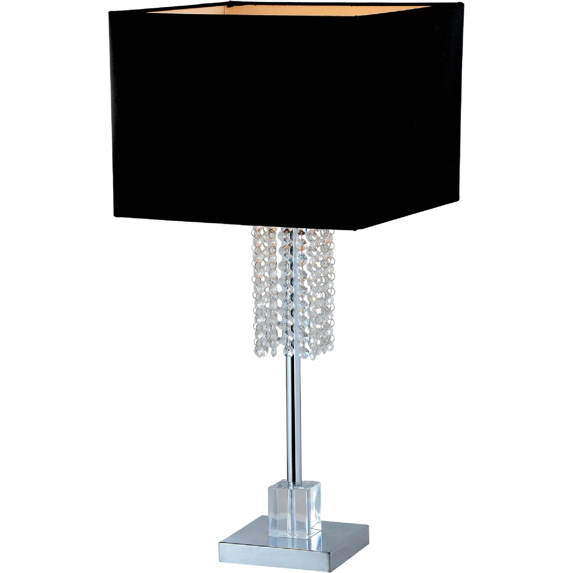 This modern crystal Adelyn 27 In. Square Chrome and Black Crystal Table Lamp by Artiva USA is the perfect addition to your home or office. Elegant, modern design adds a rich, opulent ambiance to any room. The chrome finish with a square black shade and crystal dripping will cast a soft, pleasant glow on your decor.