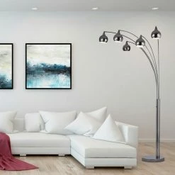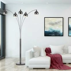 Light up your living room, bedroom or office with this sleek and modern in. Amore 86 in. 5-Arc LED Floor lamp with dimmer switch from Artiva USA. Amore is a perfect addition to any room with modern or contemporary decor. The Amore floor lamp holds Super bright LED(5000 Lumens, 375-Watt replacement) and warm LED lights (3000K) with dimming function. The curved design adds a soft note to your decor. Standing over 7 ft., the fixture has a statuesque appearance and draws attention. The ARTIVA exclusive LED floor lamp allows you to direct the light wherever you need it and provide ample lighting for reading, writing or creating a spotlight in the setting behind the couch, in the corner or in the center of your living room. Heavy weighted base grants perfect balance and prevents the lamp from tipping. ARTIVA USA exclusive, 5 true 360-degree view LED bulbs included. Beautiful Brushed Black Satin Nickel Finish. US PATENTED DESIGN. US PATENT # US D822,878 S. Model: LED9656BSN.