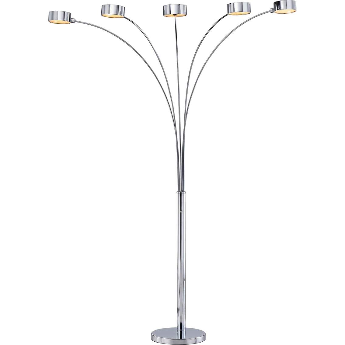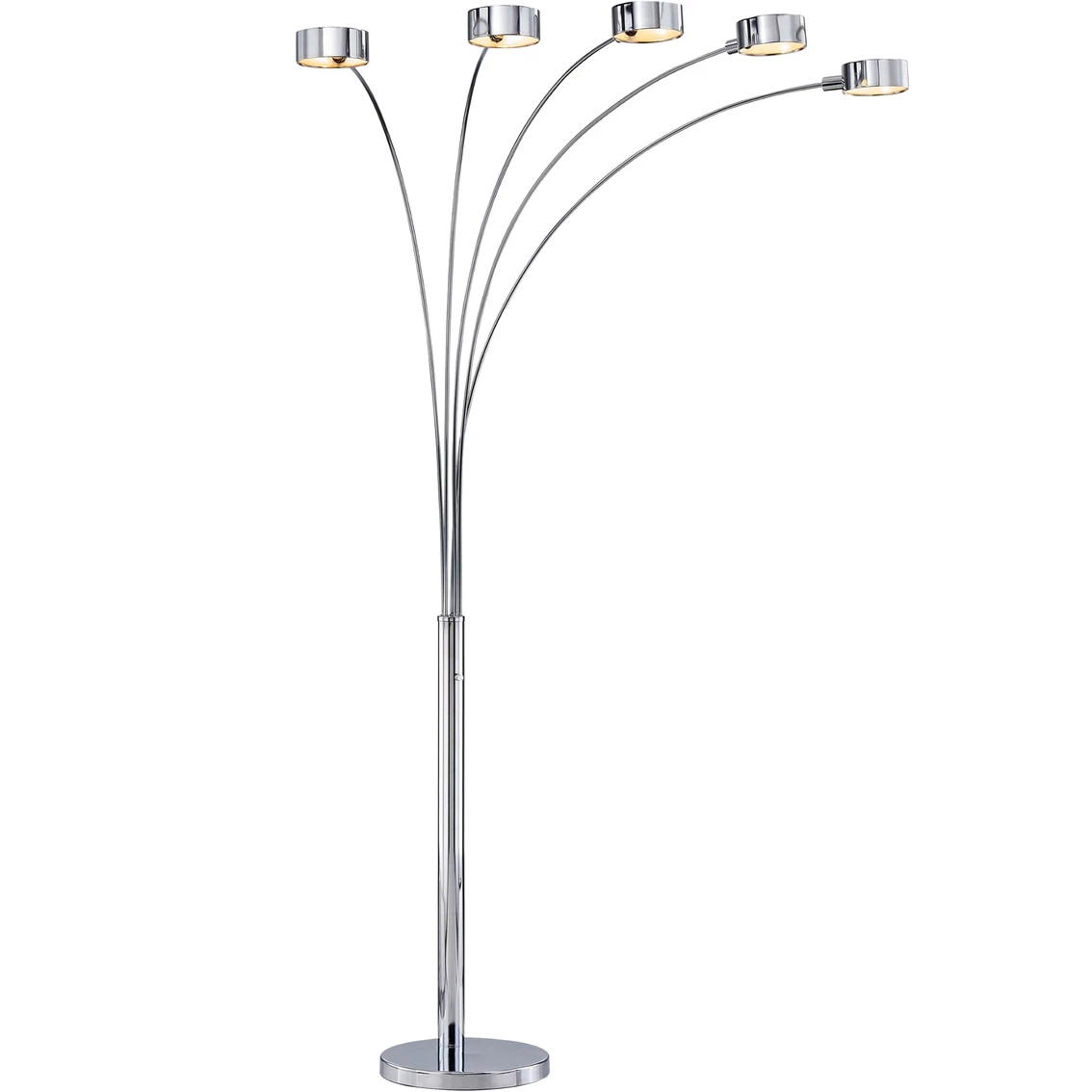 This Artiva Micah Arched Floor Lamp with Rotatable Shade and Dimmer directs the light wherever you need it and creates just the right atmosphere with a convenient full-range dimmer switch. Micah provides ample lighting suitable for reading, writing, or creating a spot light in the setting. The shades direct lights in different directions and work as filters and screens to avoid eye contact with light bulb. Perfect behind sectional couch or accent sofa in a dining room, living room or bedroom as reading lamp or primary source of light. Five E12 40-watt dimmable candelabra light bulbs included. Equivalent to 9-watts CFL or 5-watts LED bulbs (must use dimmable bulbs). Smart outlet compatible. Works with smart outlets that are Alexa, Google Home assistant or Apple HomeKit enabled to turn the lamp on/off. Beautiful modern chrome finish with full range dimmer. Model: A207901FC.