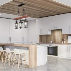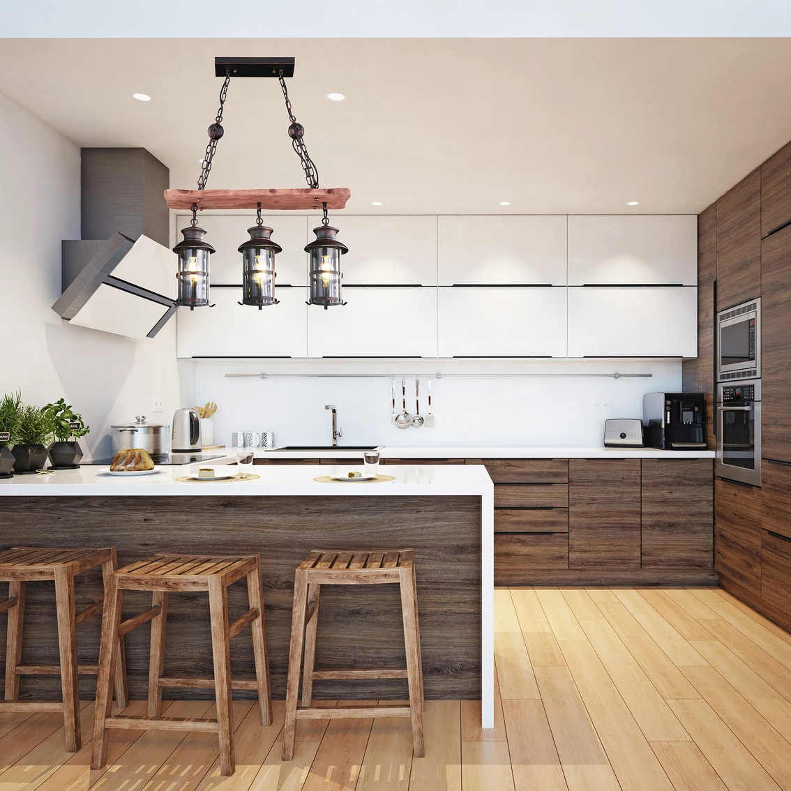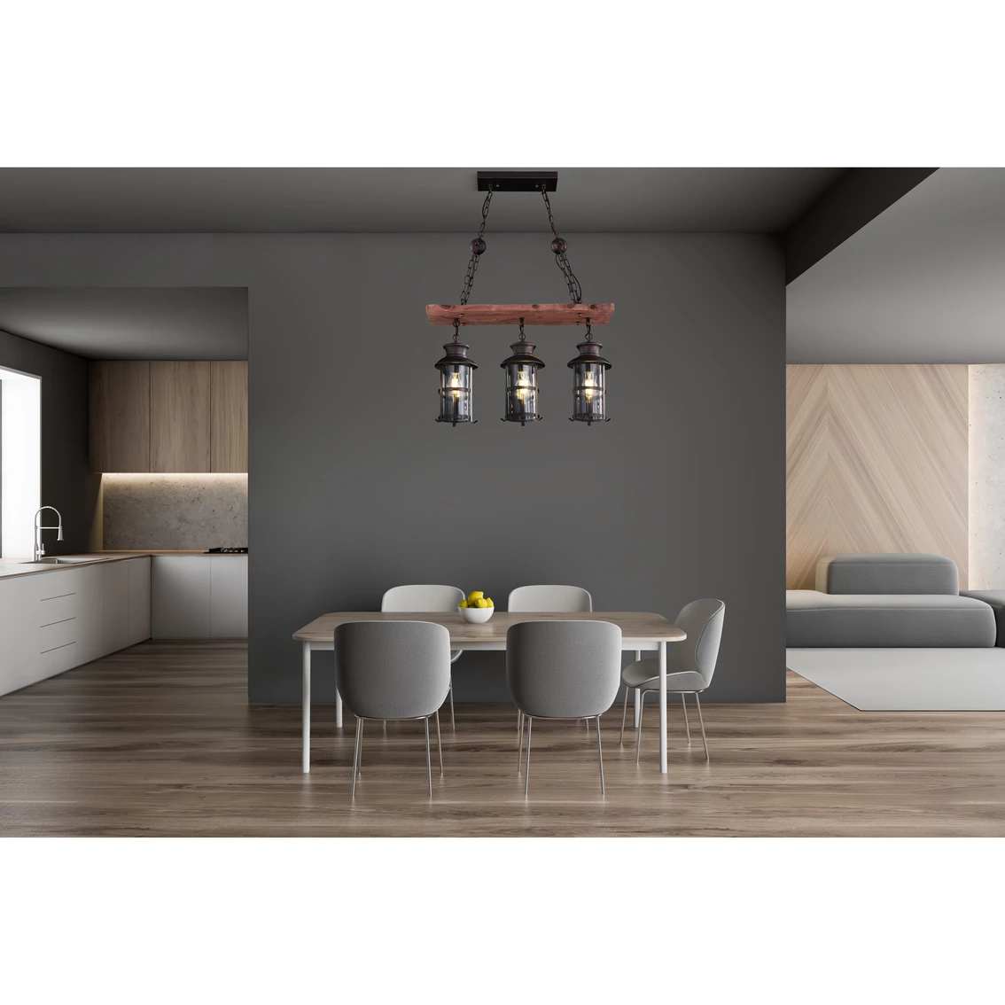 Upgrade your modern farmhouse, industrial design home or any kitchen island with this “Borgo Collection” 3-Light LED Lantern Linear Chandelier from Artiva USA. Features cozy, Antique Bronze Lantern linear chandelier/ light fixtures. Crafted of solid wood for casual, cottage feel. The antique bronze lanterns and hanging chain adds industrial flair on the design, providing contrast to the tone of the antique natural wood.