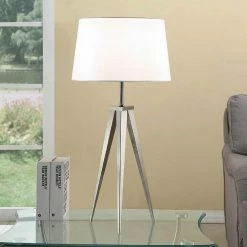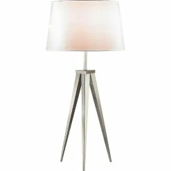 Give your living space some star power with this Artiva Hollywood 30-in. brushed nickel tripod table lamp inspired by the lighting fixtures used to make movie magic. This fun table lamp sports a modern, simple heavy duty three-legged base that can withstand unexpected bumps or jostles, and it has a soft off-white silk shade to diffuse the light from the single 3 way bulb. Features: Modern brushed nickel finish, Simple tripod modern lamp. Model: A501108TSN.