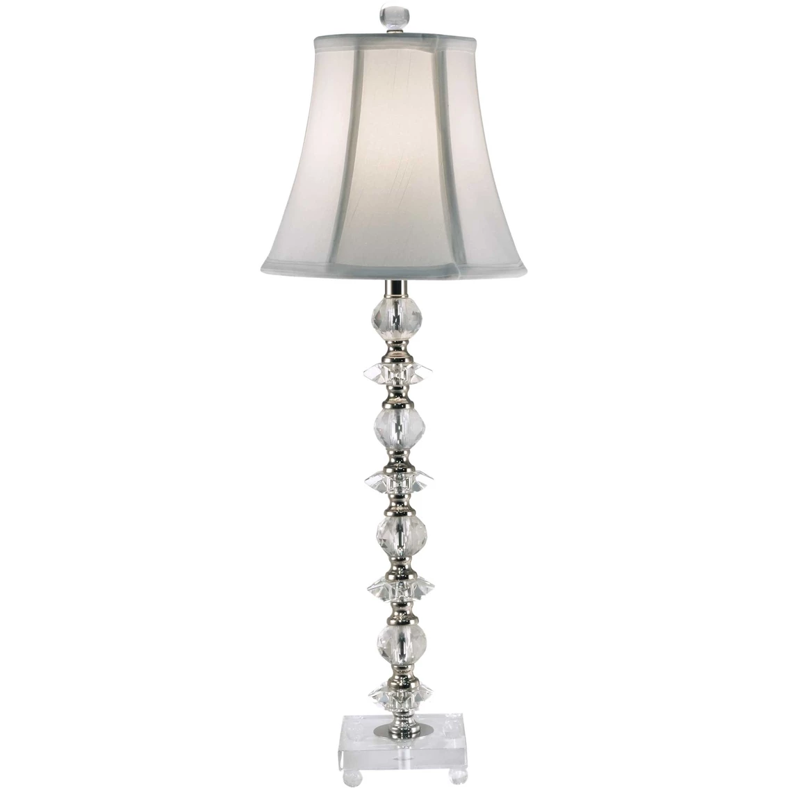 This Dale Tiffany Parvan Buffet Lamp is an elegant addition to any decor. This contemporary buffet lamp features a center column that is encased in an alternating series of solid crystal spheres and disks. Each crystal piece is separated by a metal column break, which beautifully showcases the beauty of each crystal element. Parvan’s base is a square of solid glass, resting atop metal ball feet and is paired with a flared shade in natural fabric, which will direct the lamp’s light downward over the metal, glass and crystal, casting a multitude of glittery shimmers about your room. The lamp’s beauty shines through when displayed on a buffet or console for a truly mesmerizing effect your family and guests will enjoy for many years to come. Model: GB11065.