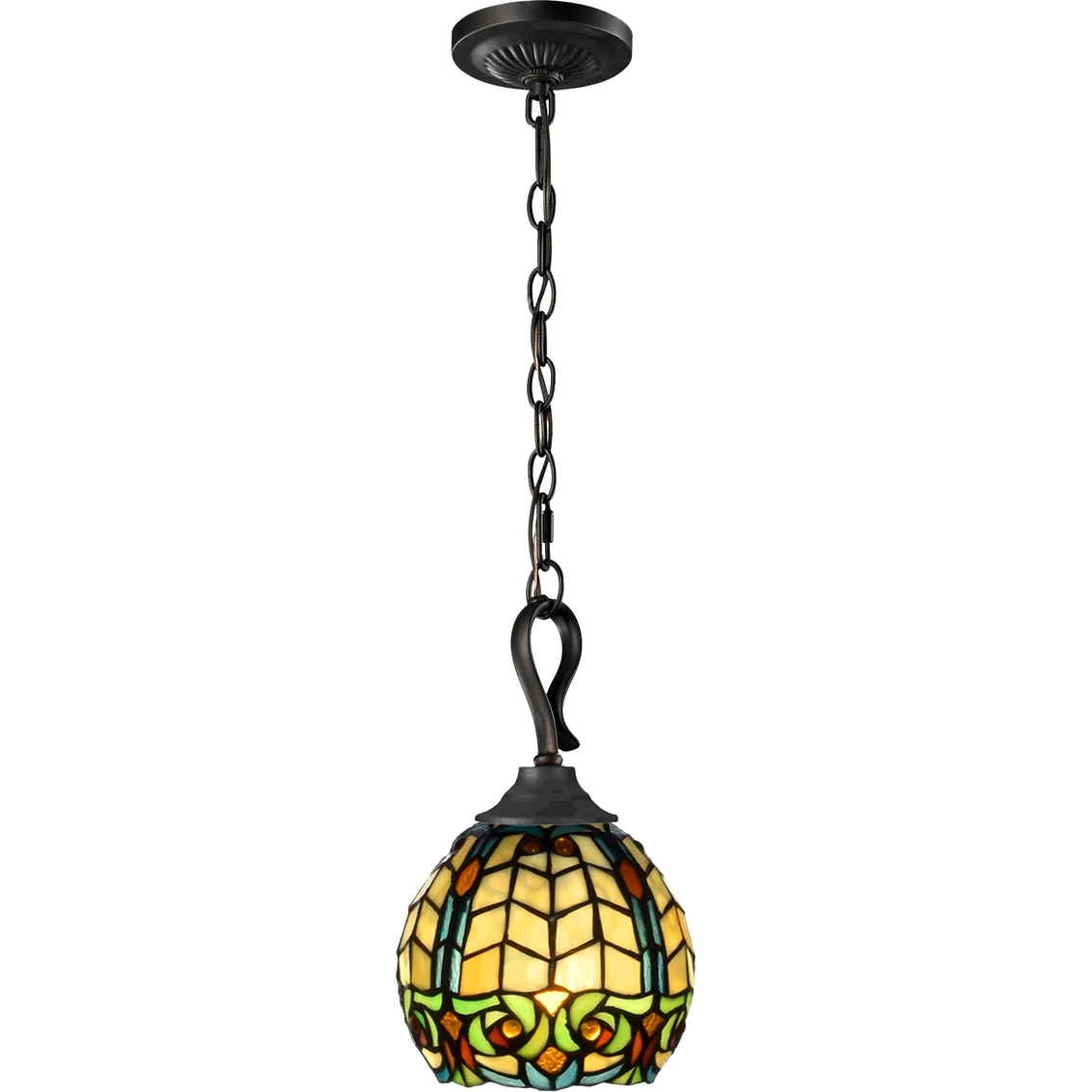 The pendant features a dome shade with a background of sunny light amber set in a fashion that creates a three-dimensional illusion. Vertical bands of amber, green and blue extend down and outward to create an interwoven vine around the shadeβs bottom. They added amber art glass gems throughout the bottom for added texture, color and sparkle when the pendant is illuminated. Raphael hangs beautifully from a round metal ceiling canopy, wire cable/chain and vase cap that are finished in Antique Bronze which perfectly complements the colors in the shade. A pretty way to light an occasional table or vanity, try hanging the Dale Tiffany 46 inch Raphael Tiffany Mini Pendant in multiples over a kitchen island or breakfast nook for an extra special look you will enjoy for years to come. NOTE: Due to the nature of handmade art glass, colors, sizes and patterns may vary slightly. Model: TH21085.