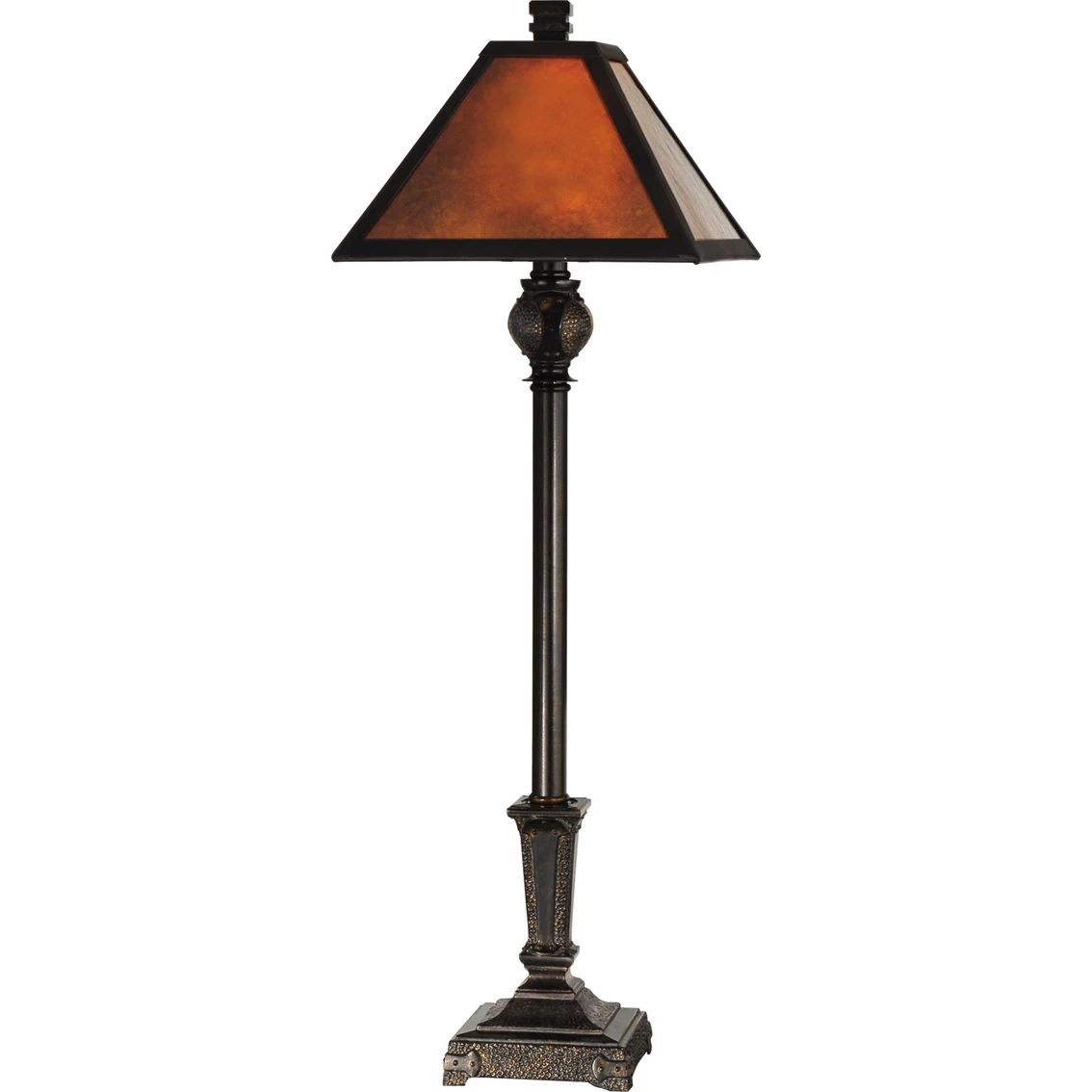 Clean lines and simplicity in the design come together in an aristocratic buffet lamp that will work well in any room in your home or office. The rich, deep amber art glass panels in the mission style shade will glow warmly when the lamp is lit. The stately metal base, finished in fieldstone features pebble detailing around the bottom. Model: TB11012.