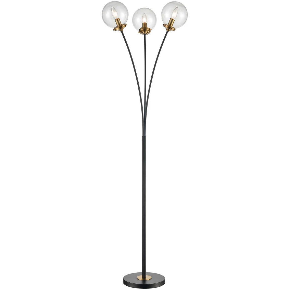 Transcending the boundaries of lighting innovation and style with the artful designs of Dimond Lighting. Bold Boudreaux 3-Light Floor Lamp in matte black and burnished brass finish. Features mouth-blown clear glass orbs. Uses B10 LED bulb. Model: D4481.