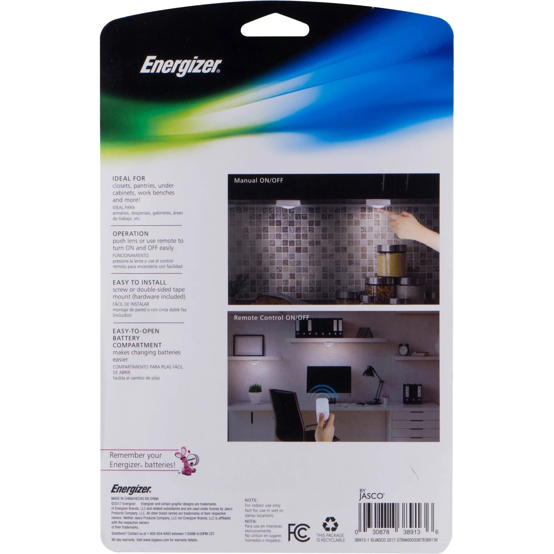 The power of light is at your fingertips with these Energizer Puck Lights. Enjoy the simplicity of either a remote or tapβstyle ON/OFF operation from a reliable light source. The energy-efficient LEDs provide the ideal brightening solution for any room in your home in need of extra light. Utilize the puck lights in your closets, pantries, attics, bedrooms and more. The puck lights also function as the perfect night light, providing enough illumination to take you safely through your evening routines. No electrical wiring makes for quick and effortless installation. Simply use the included doubleβsided tape or keyhole slot to position the tap light wherever you need it. Pack includes two puck lights. Model: 38913.