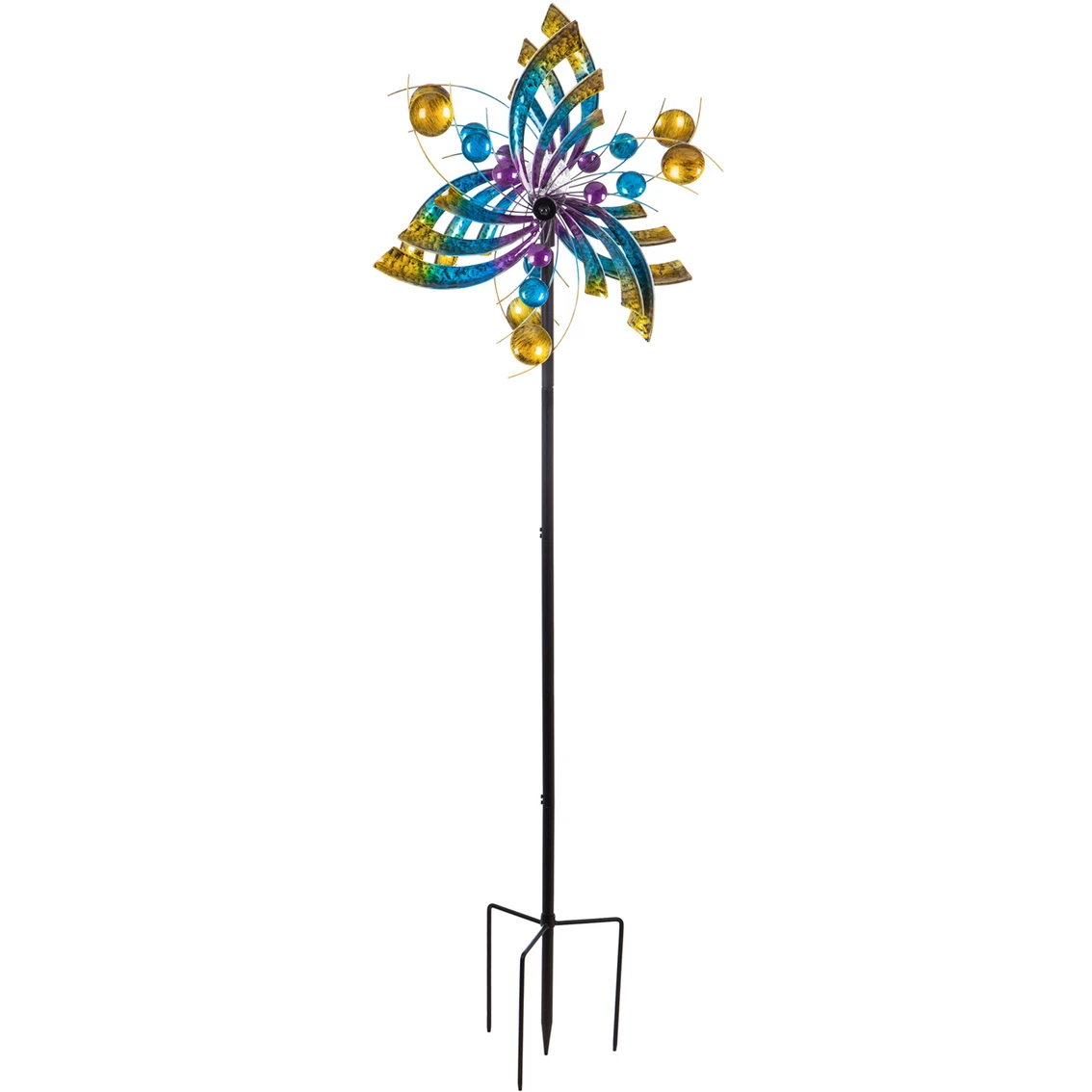 Evergreen 75 in. H Solar Wind Spinner, Bubbles and Blades – This solar kinetic wind spinner is gold, blue and purple with a blade / bubble design. Inside is a clear orb that illuminates multicolor in the dark. It includes a 3 prong Stake and Pole: .87 in. =22mm. 24 in. W x 10.25 in. L x 75 in. H. Assembly required. Model: 2SP6128.