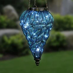 Exhart brings you this blue Tear Shaped Solar Glass hanging lantern framed by a beautiful metal design, which makes an elegant statement! A glow will automatically illuminate from within as the 15 solar-powered LED firefly lights begin to glow at dusk. Hang anywhere in your garden you want a dazzling touch! Model: 13175-RS.