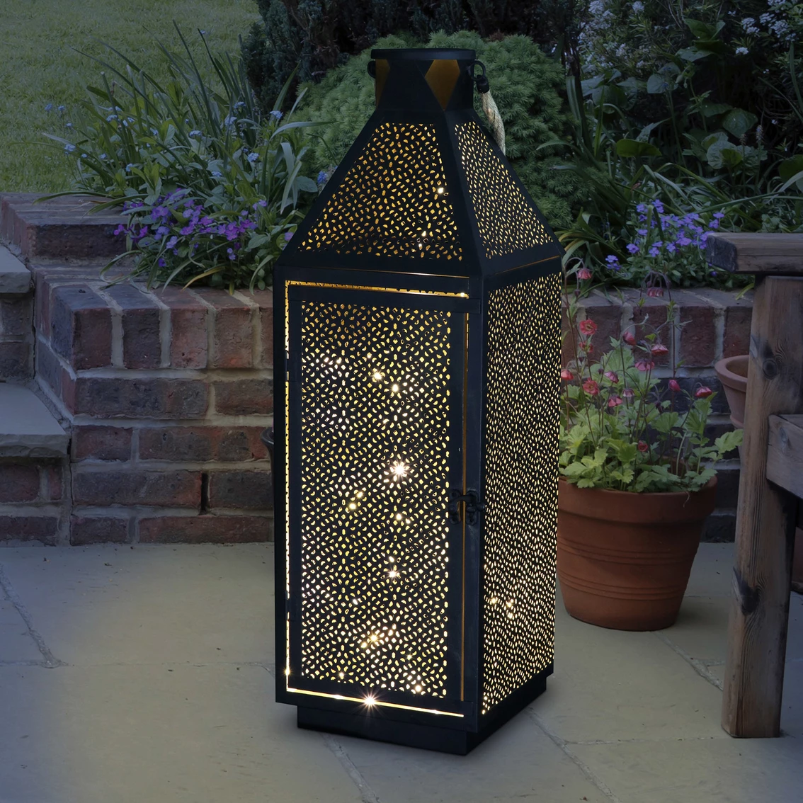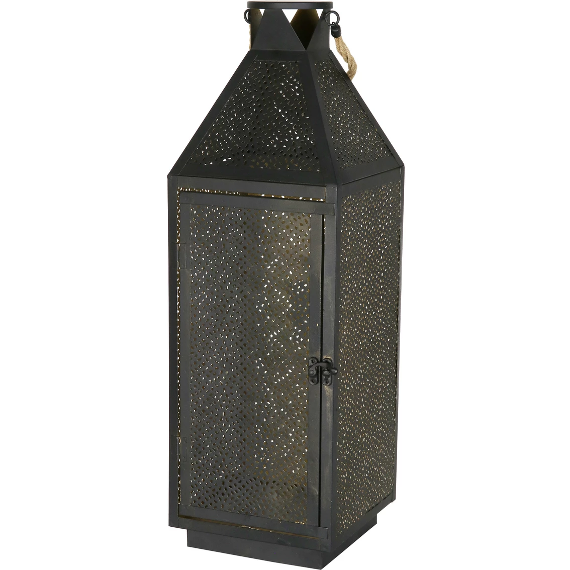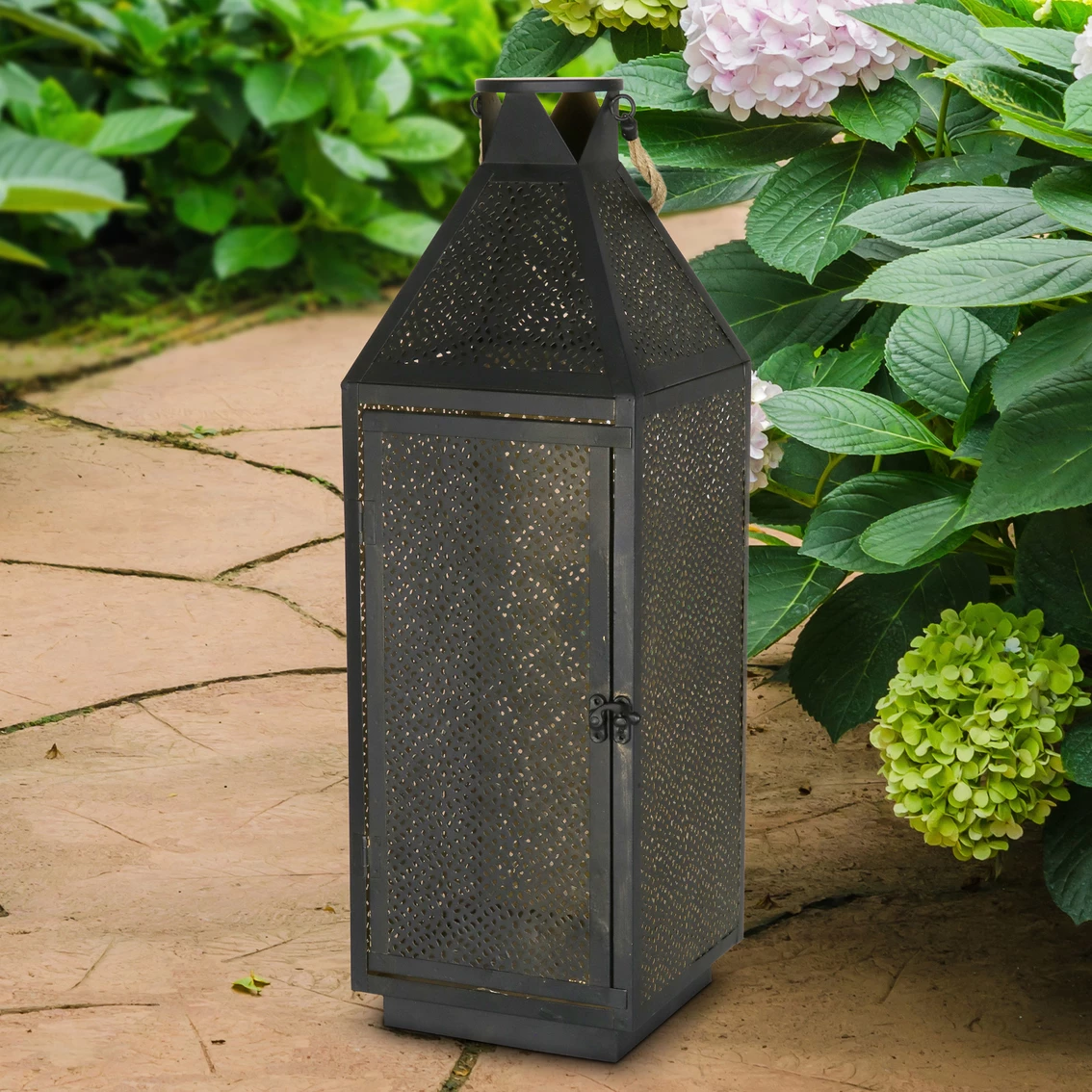 This beautiful Black Metal Filigree Lantern will illuminate at your desired hour each day! Simply set the battery operated timer and 50 LED lights will glow, offering you a beautiful decorative light. Perfect for indoor or outdoor use. Adorn your living room, patio or garden with Exhartβs exquisite black metal lantern. It showcases an enclosed long box body surrounded with an intricate metal filigree design which is only more beautiful when illuminated from within! This filigree hanging lamp adds a touch of class and elegance reminiscent of the Victorian Era. Perfect for when you want to add a soothing indoor and outdoor accent light. Itβs a wonderful addition to create a lovely ambiance for your home. Standing at 22 inches, this black metal lantern with accent lights works best as a ceiling dΓ©cor for the staircase and balcony, or as a simple tabletop lantern for your coffee, side or bedside table. Every aspect of this hand-crafted lantern has been meticulously designed by the Exhart team.
