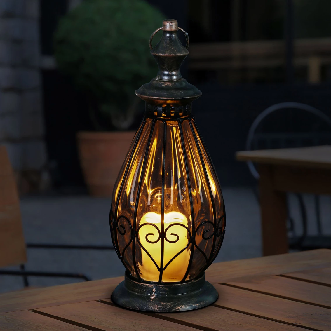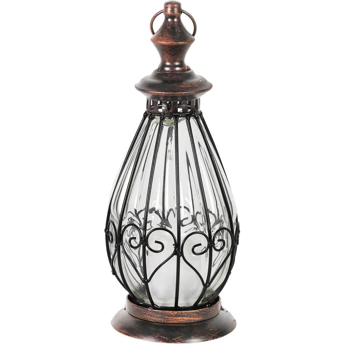 A elegant metal and glass lantern from Exhart adds a perfect glowing light to your home or garden. Beautiful details including metal scroll work and an internal LED candle set this exquisite lantern apart. Simply set the battery operated automatic timer to your desired hour and your lantern will illuminate for you! Model: 18642-RS.