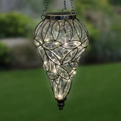 Framed by a beautiful metal design, this tear-shaped 7 x 24 in. Solar Hanging Glass Lantern from Exhart makes an elegant statement! A glow will automatically illuminate from within as the 15 solar-powered LED firefly lights begin to glow at dusk. Hang anywhere in your garden you want a dazzling touch! Model: 13173-RS.
