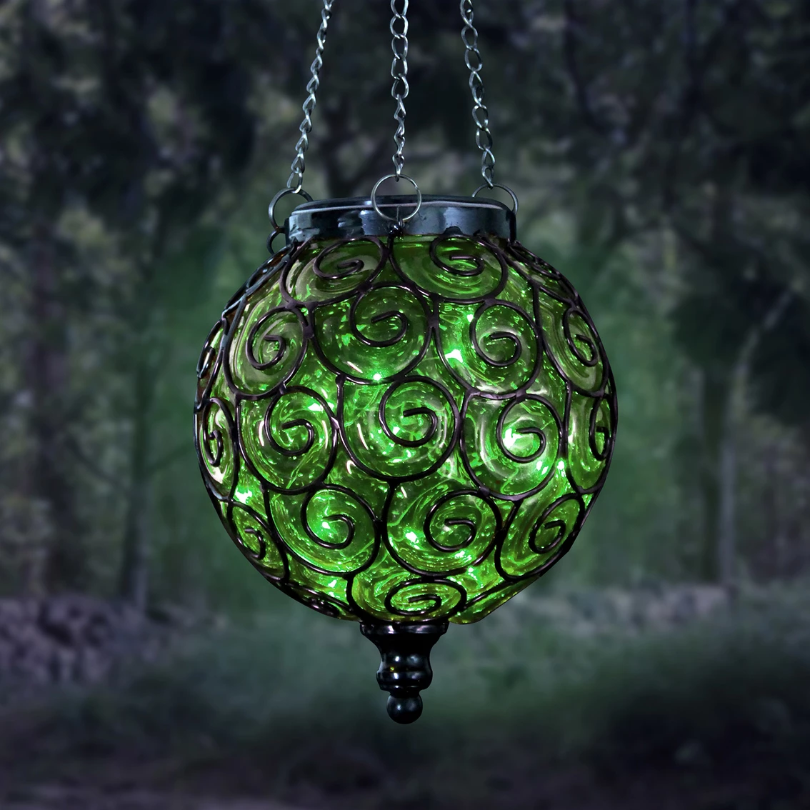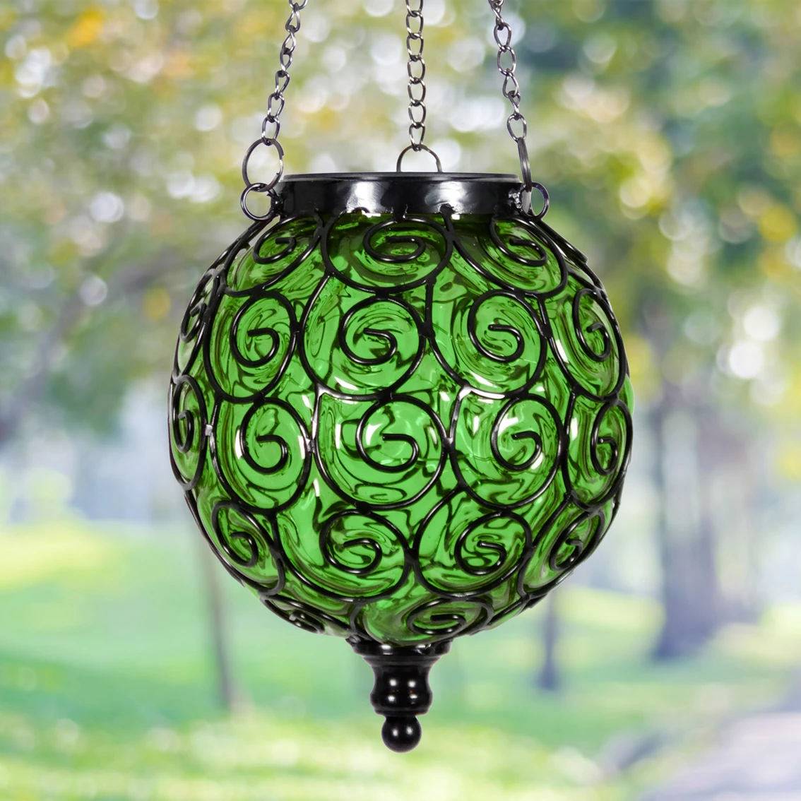 An elegant Green Solar Glass Ball surrounded by a beautiful metal scroll design sets this gorgeous hanging lantern apart! A glow will automatically illuminate from within the ball at dusk with its string of 15 solar-powered firefly lights. This lantern from Exhart adds a dazzling touch to your garden! Model: 13172-RS.