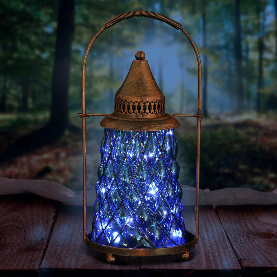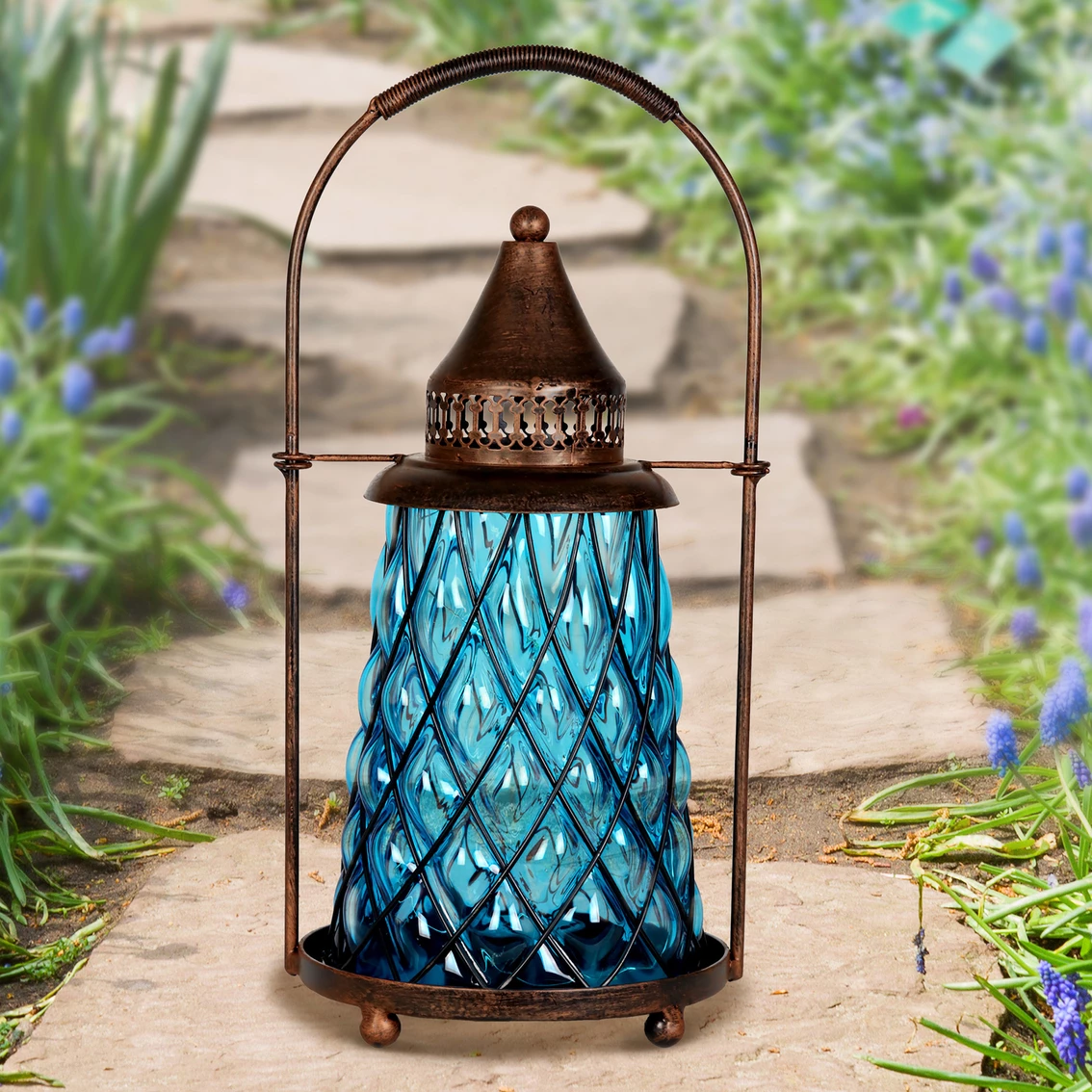 Add a charming touch to any outdoor space with this Exhart Solar Vintage Metal and Glass Lantern in sea blue. 15 Firefly LED lights will automatically illuminate at dusk adding a magical glow to your garden! Framed by a classic metal design with a handle, this beautiful piece makes an enchanting decorative light. Model: 15252-RS.