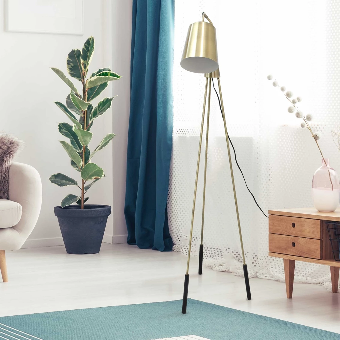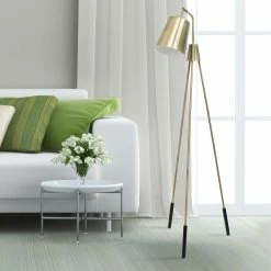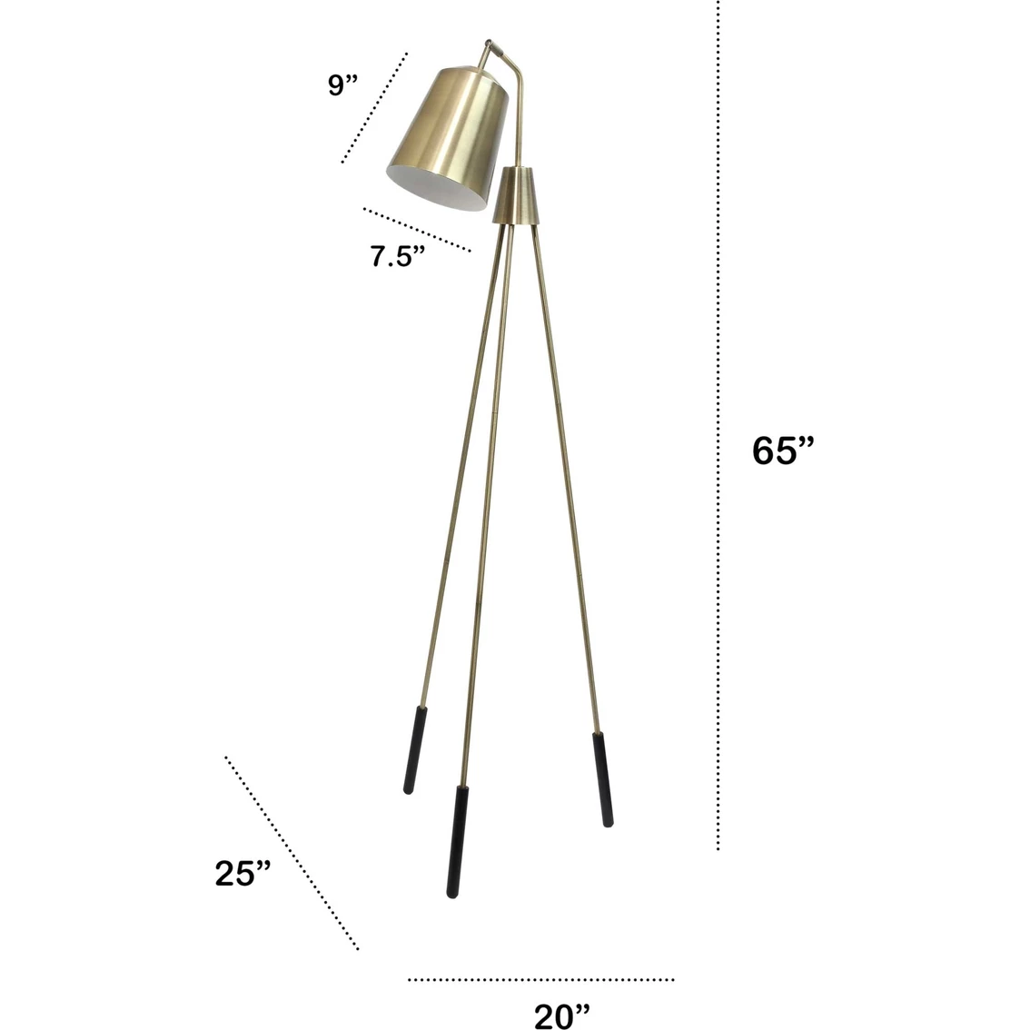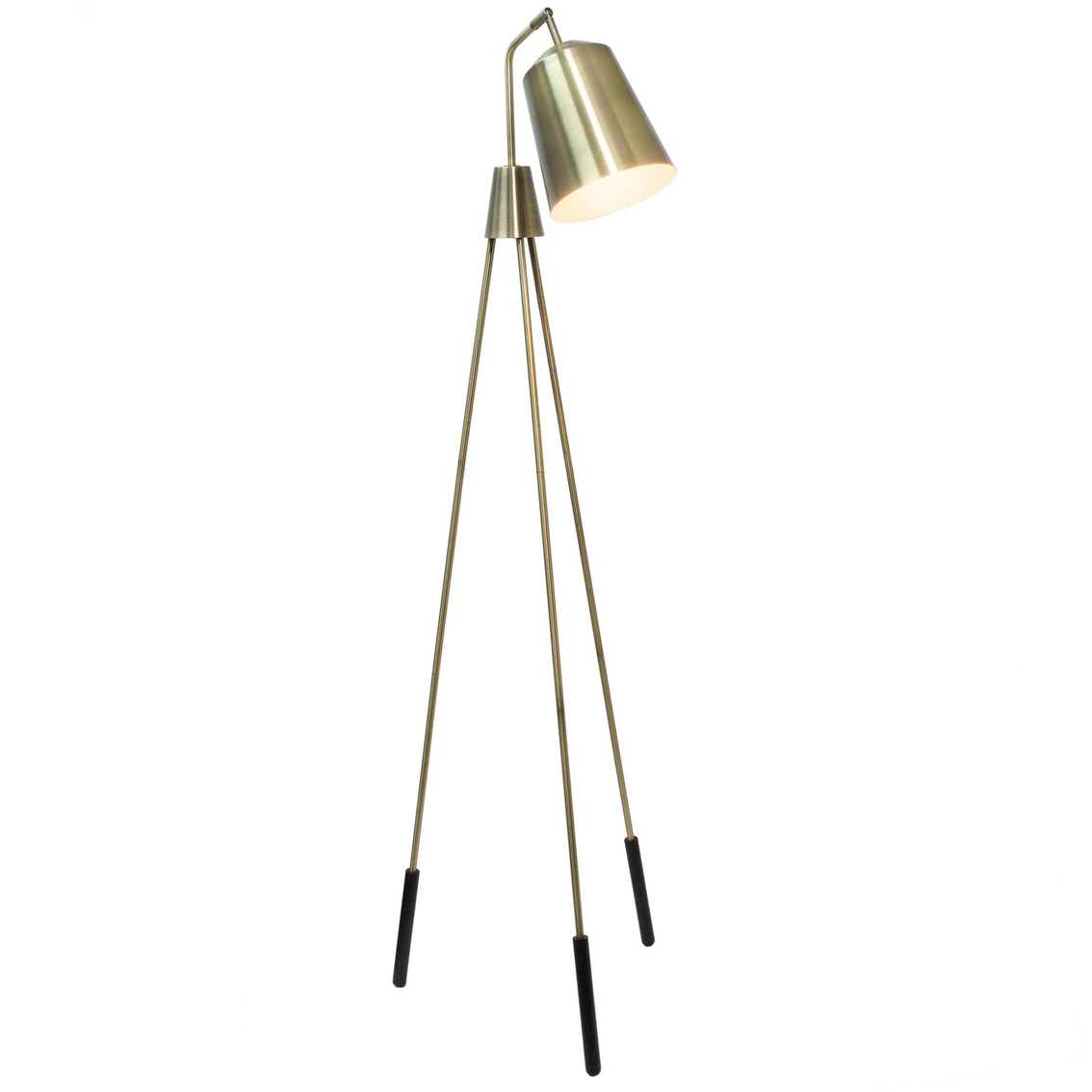 Illuminate your living space with this loft style Lalia Home Industrial 1 Light Tripod Floor Lamp in Antique Brass. It features a spotlight shaped shade in a stunning antique brass finish for a sophisticated look while the black tripod base adds an industrial touch. Perfect for your bedroom, office, foyer or living room! Model: LHF5016AB.