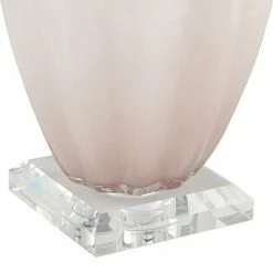 The softest pink blush glass lends a warm ambiance to this contemporary table lamp from Pacific Coast. A curved silhouette is augmented with wide, vertical spines that create wonderful dimensionality in any living space. The design sits atop a sparkling crystal base and is topped with a drum shade for beautiful illumination. Measures 28.5 in. Model: 87-11211-54AC.