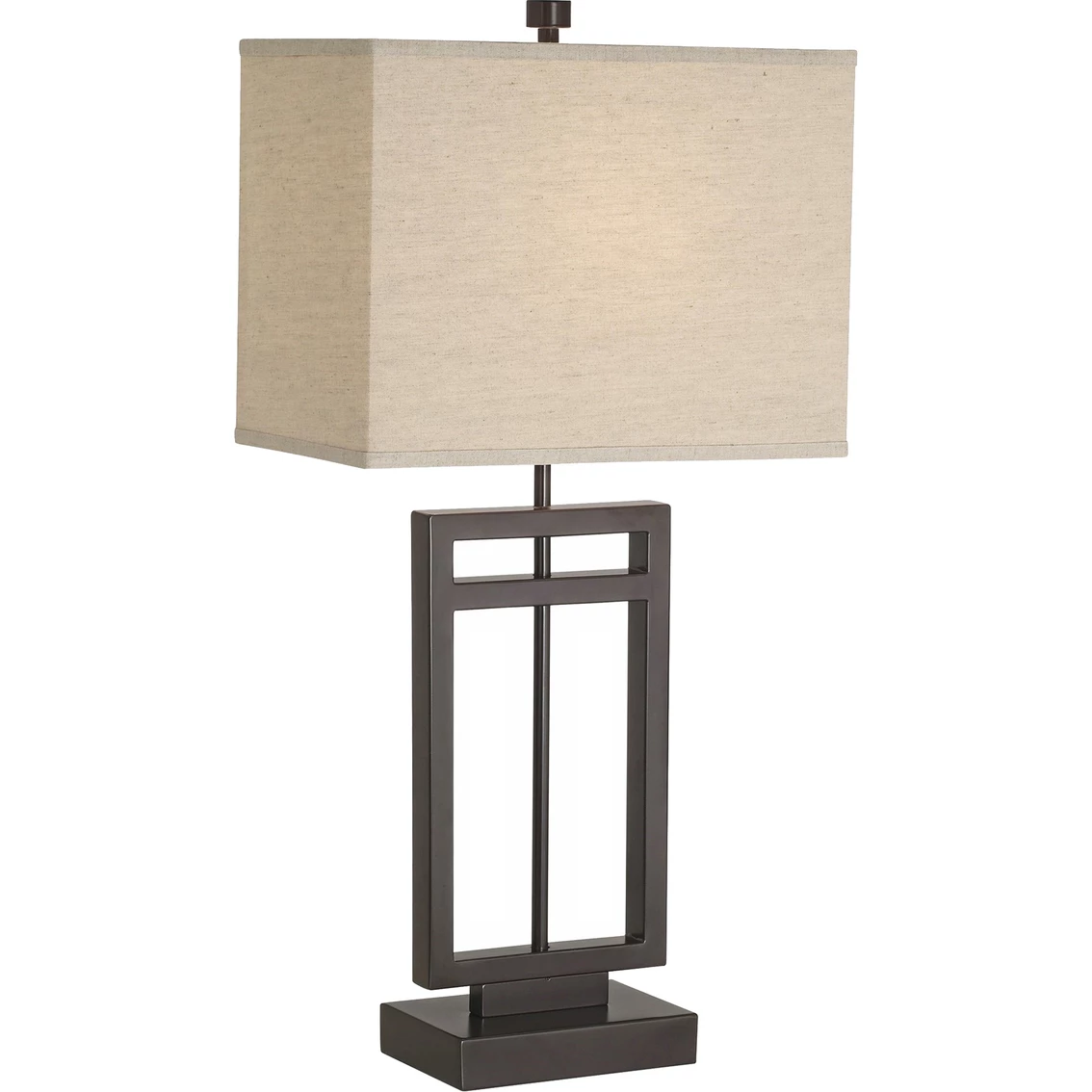 Displaying an open base and rectangular linen shade, this metal table lamp is a charming addition. Offering a bronze finish over a metal tube body, this lamp rests on a rectangular base. Model: 87-6576-20.