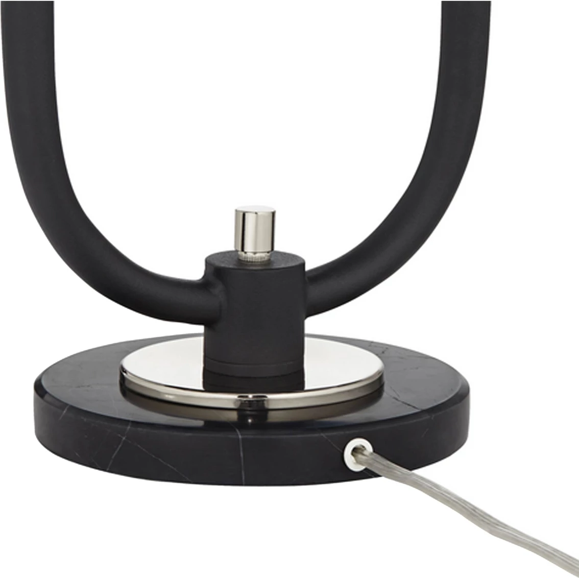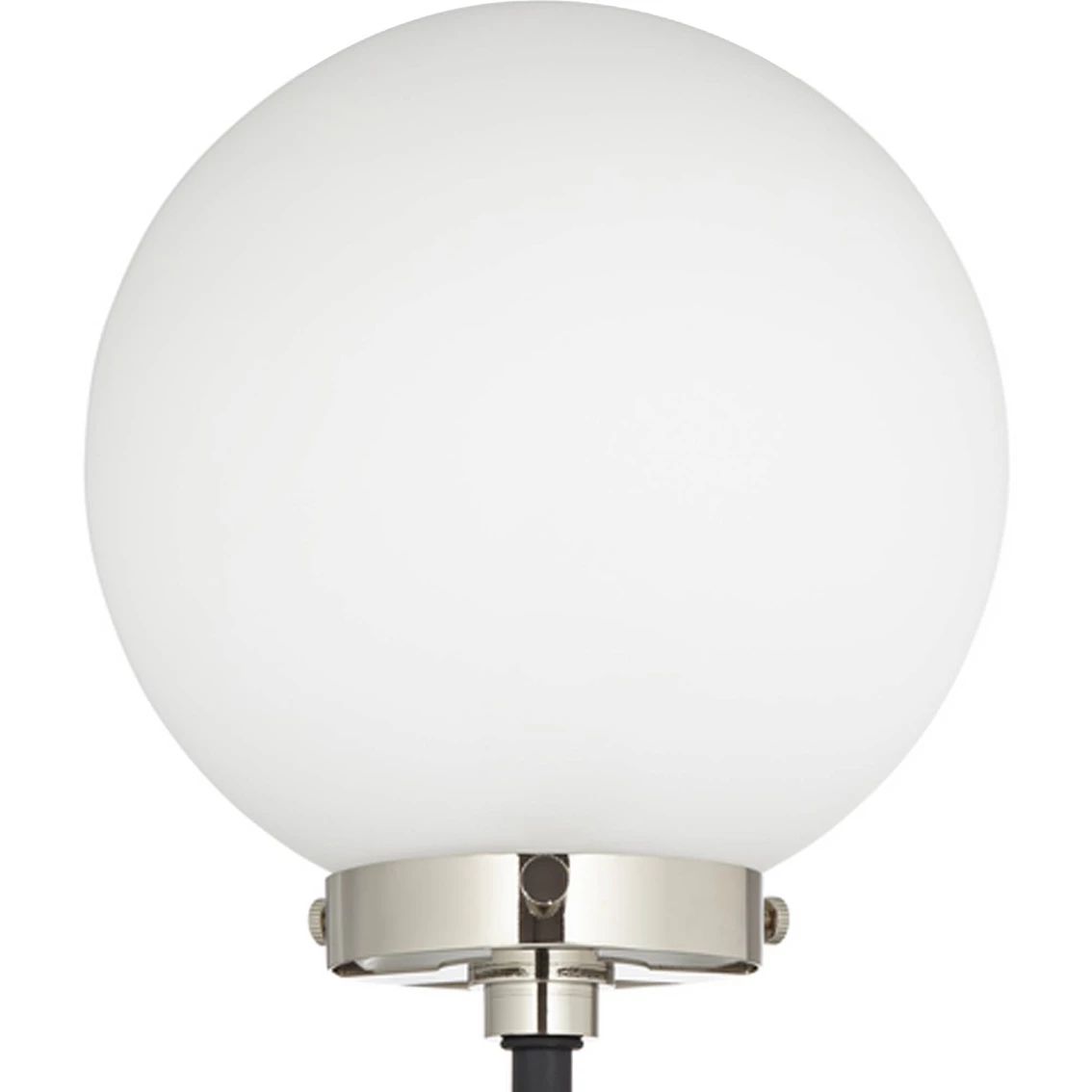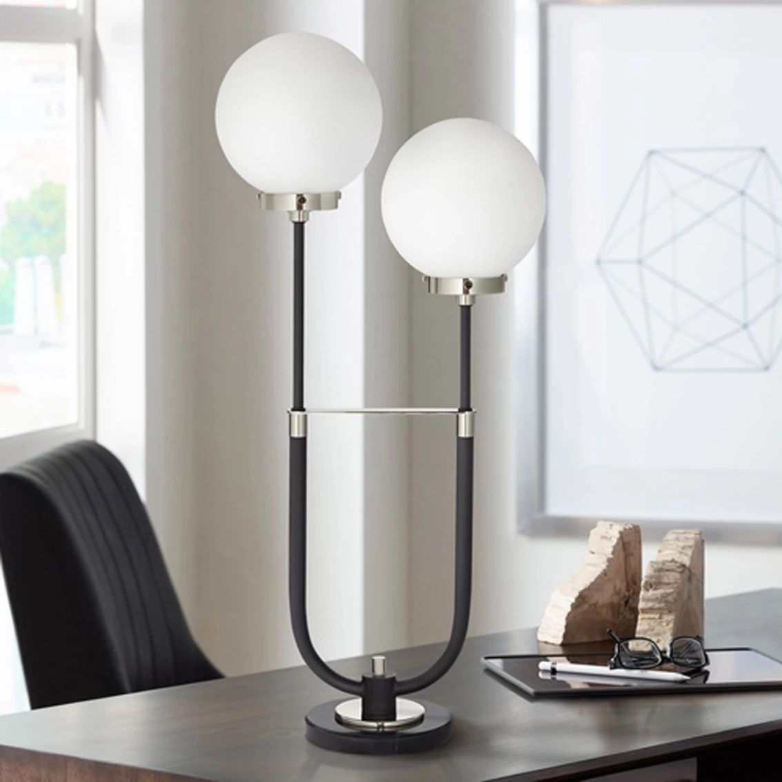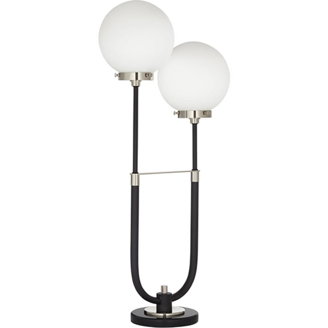 Gorgeous white glass globes on this contemporary two-light table lamp from Pacific Coast bring stellar style to your home. Offering lovely up lighting for inviting ambiance, the lamp features a black finished base and U-shaped arm touched with hints of polished nickel to provide contrast. Add this lamp to a console table in the living room or a credenza in your home office. Measures 29.85 in. Model: 87-11243-07.