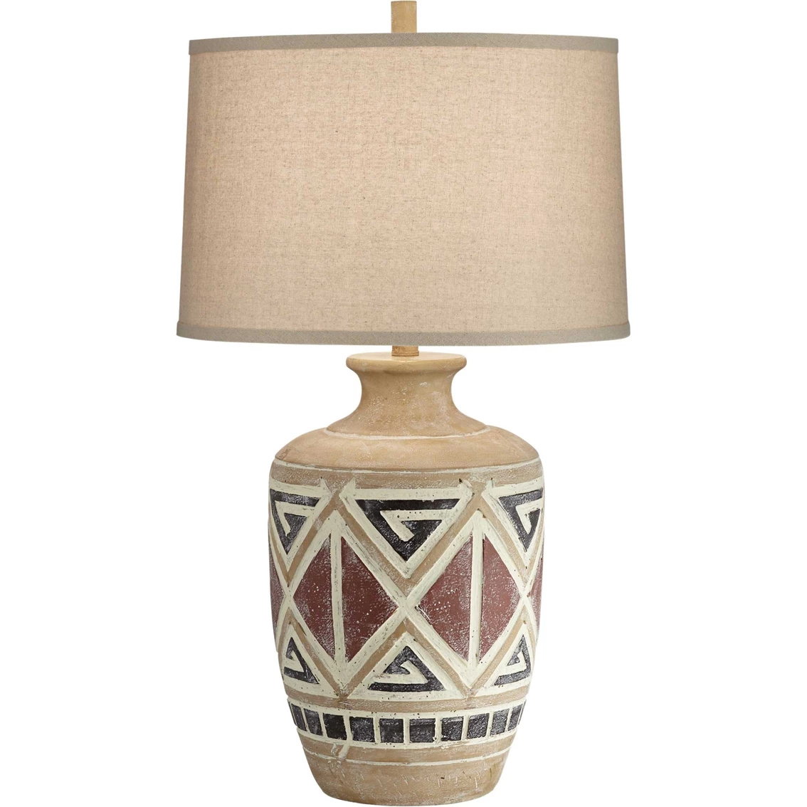 Fill the room with southwestern style and light with the Pacific Coast Utica Table Lamp. The Utica is a 30 in. poly southwest jar table lamp with multicolor finish and an oatmeal round shade. Model: 77K09.