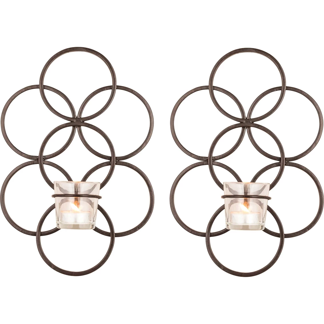 Update the look of any room with the San Miguel Tunis Wall Sconce 2 pc. Set featuring two 12.5 in. matching interlocking circular iron wall sconces in a scroll design. Each has a glass votive holder. Candles sold separately. Model: 917158.