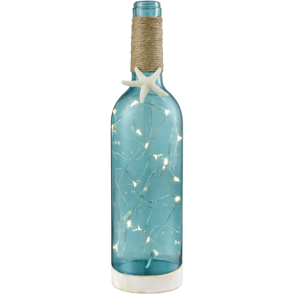 Vineyard Lighting Bottle from San Miguel with “Starry Lights”. Glass bottle features jute wrap and decorative starfish. Includes strand of LED Starry Lights. 3 AA batteries required. Model: 291142.