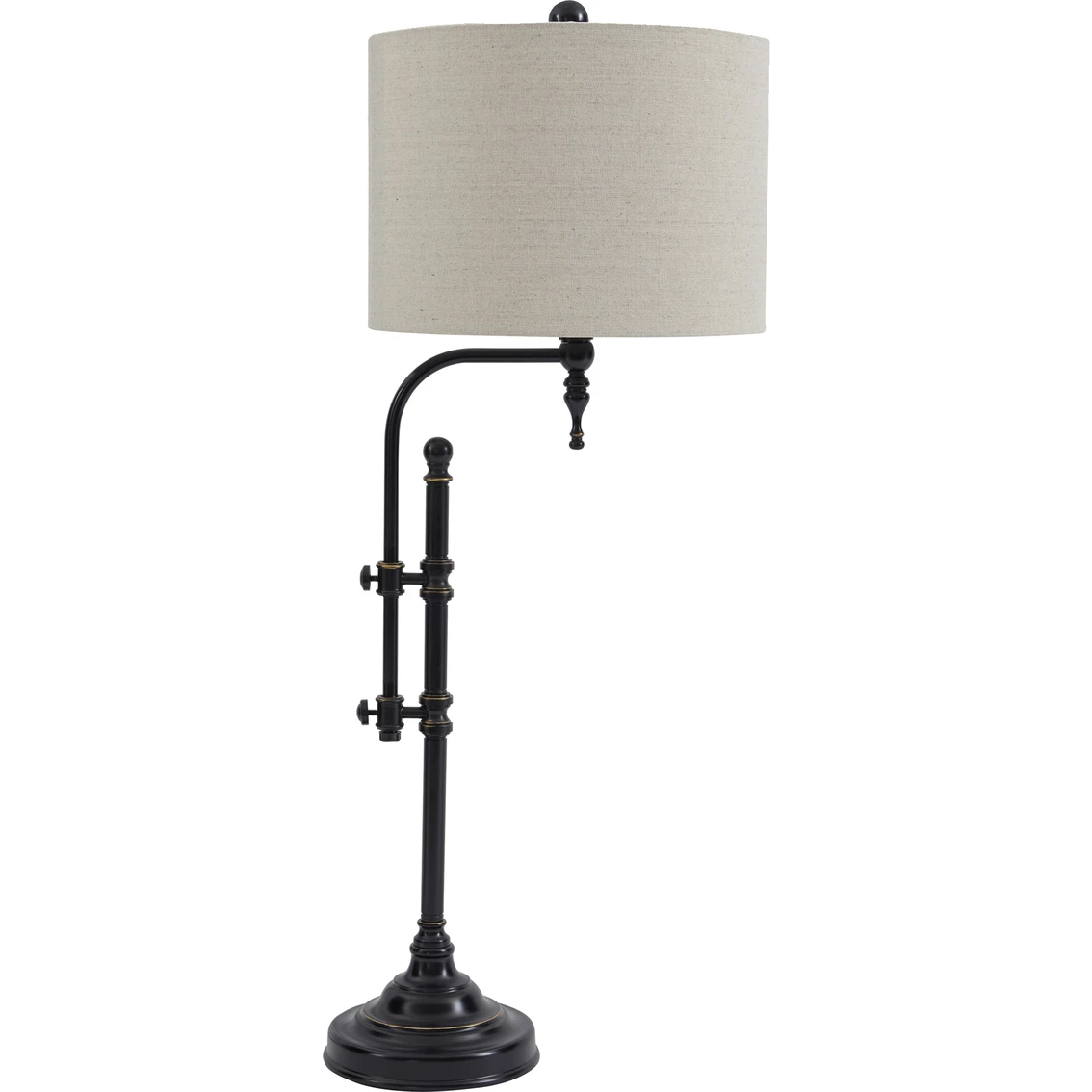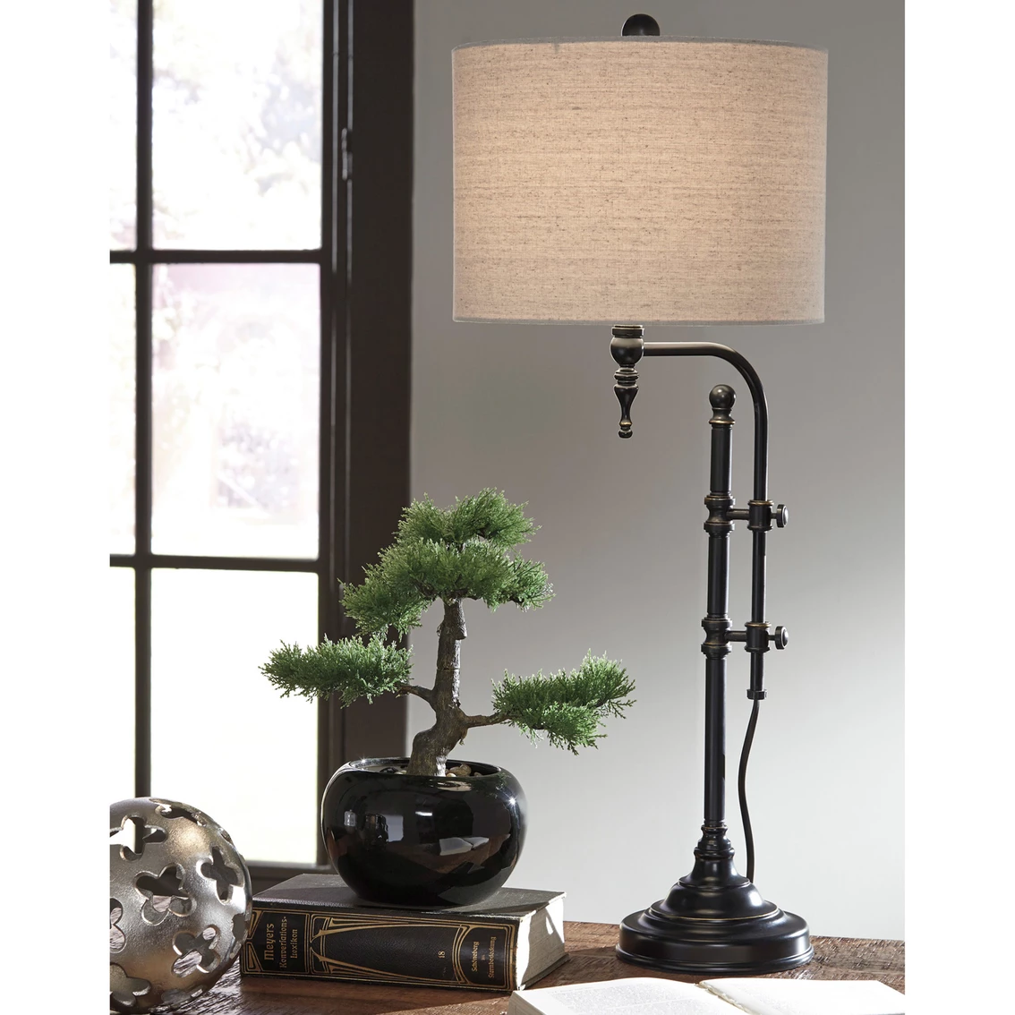 Up your style with the Signature Design by Ashley Anemoon table lamp that takes a charmingly unique stance on lighting. Simply turn the pair of knobs on the sculptural metal base to adjust the light to the perfect height. How delightful. Model: L734252.
