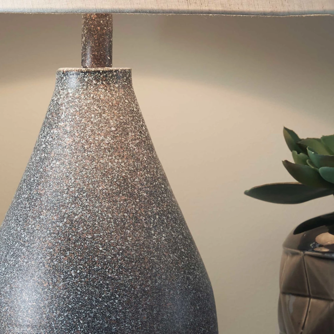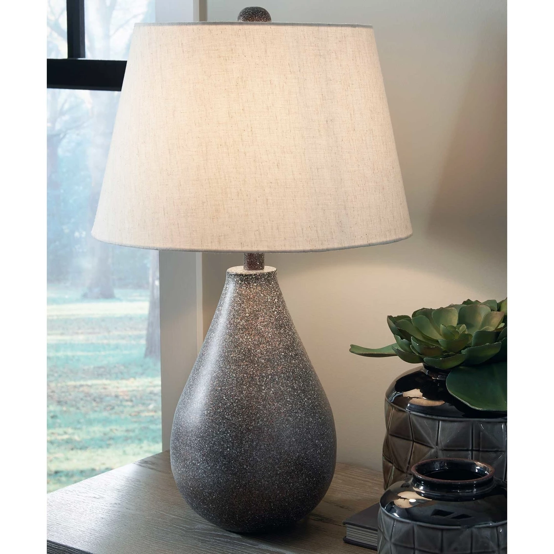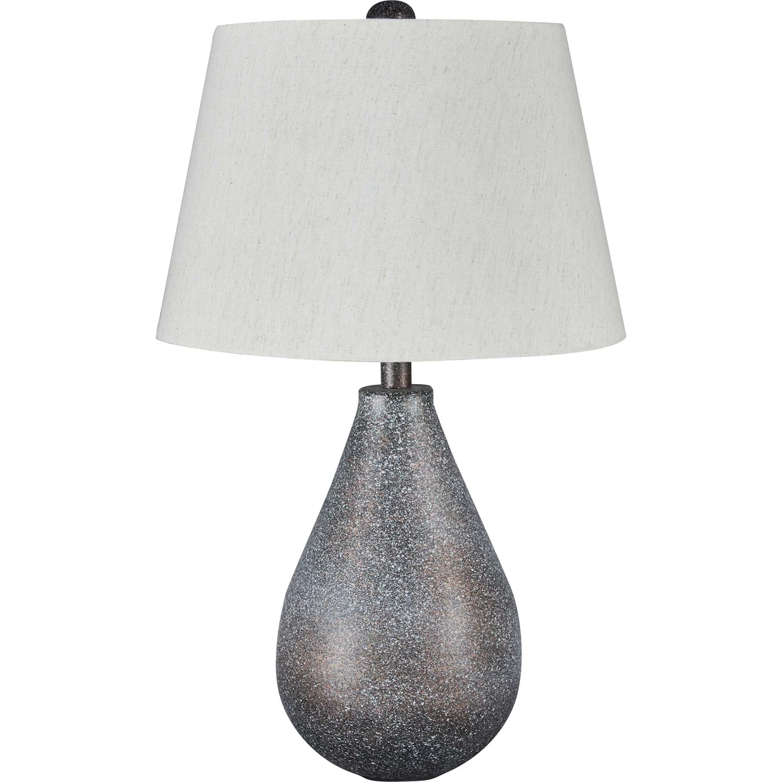 Shine a contemporary spotlight on your good taste with the Bateman lamp from Signature Design by Ashley. The speckled patina finish adds a modern simplicity to any space. With a hardback shade in a tapered drum shape, this light will illuminate your decor with style. Includes 2 lamps. Model: L204234.