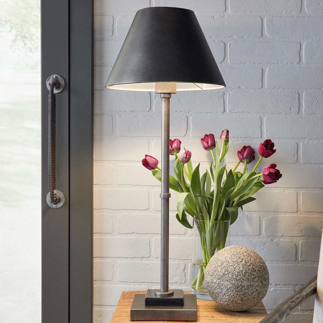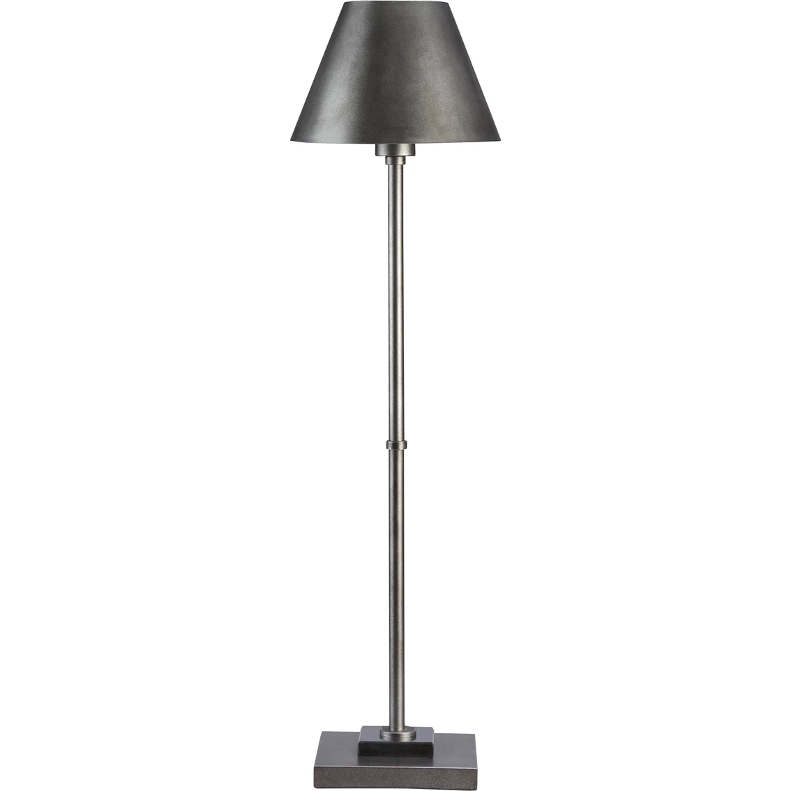 This sleek and chic Belldunn table lamp from Signature Design by Ashley is made of metal and marble with a metal empire shade. It features an antiqued pewter-tone finish and an on/off switch. This lamp has a 1 E26 socket for a type A bulb (not included). Model: L2083.