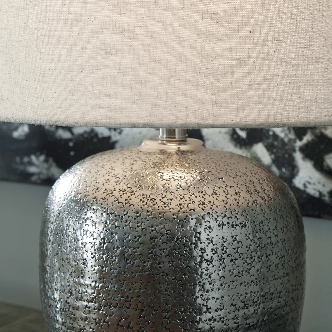 Stay trendy with hammered aluminum that exudes urban refinement. The Signature Design by Ashley Magalie table lampโs silvertone sheen will fill any space with well-lit splendor. Lamp includes modified drum shade and 3-way switch. Requires type A bulb (sold separately); 150 watts max or 25 watts max CLF; UL Listed. Model: L207314.