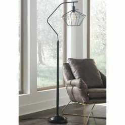 Dare to bare with the Makeika floor lamp from Signature Design by Ashley. Modern industrial style in a whole new light, this fabulous 62 in. floor lamp simply wows with a sleek, sculptural base and open cage metal shade, suspended for added drama. Model: L207181.