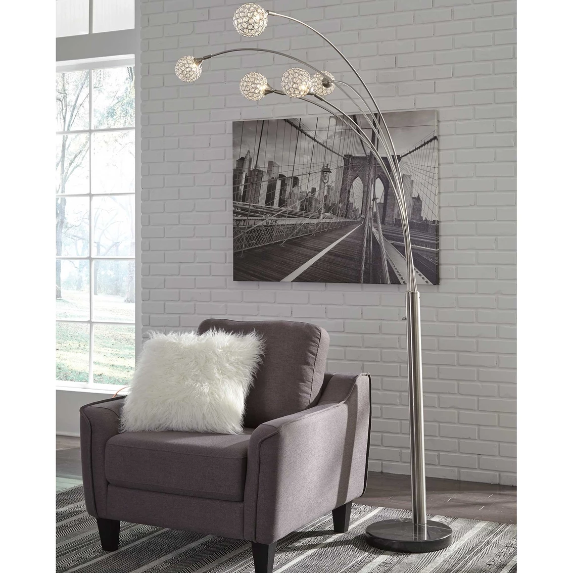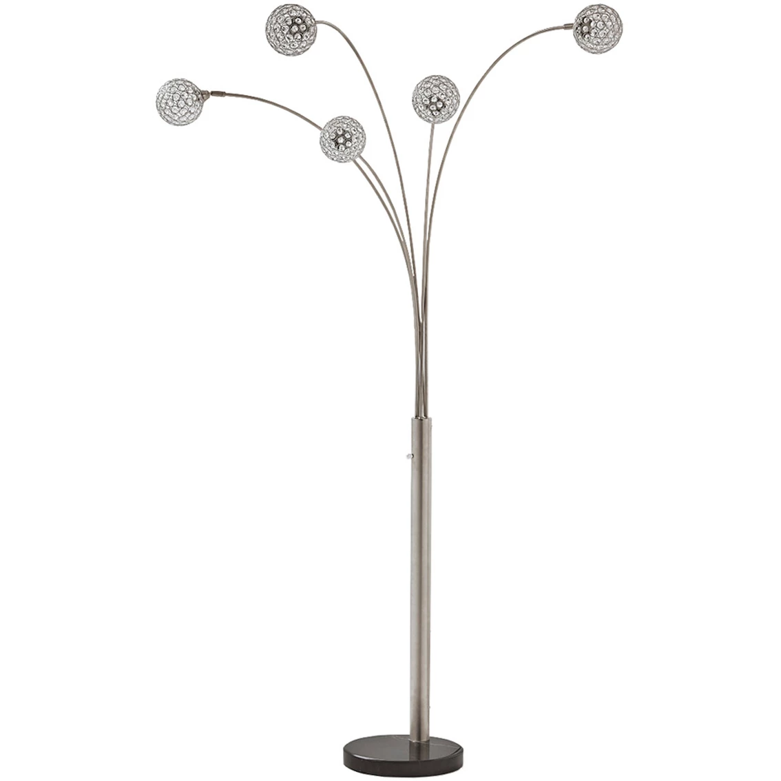 Have a ball bringing highly contemporary style to a space with the Winter 5-light floor lamp from Signature Design by Ashley. Crystal-like acrylic balls spread light in such an illuminating way. Chrome-tone metal and black marble richly enhance the designer aesthetic. 95 in. tall. Model: L725089.