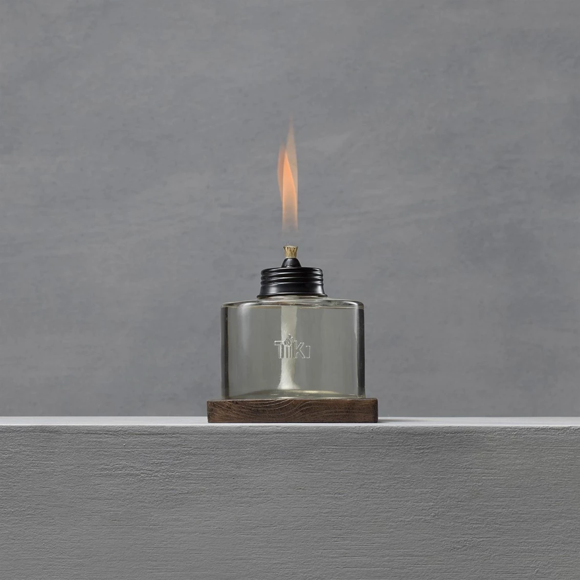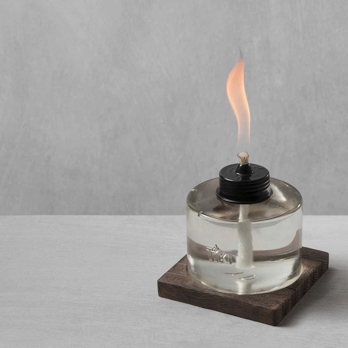 This 4-inch votive table torch from TIKI will surely brighten up any outdoor table. The clear glass fuel vessel with brown base fits with any decor or table setting. Use with TIKI Brand Clean Burn BiteFighter Fuel and enjoy proven mosquito repellency and up to five hours of burn time. Model: 1117025.