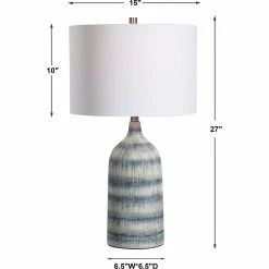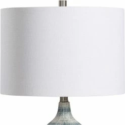 This casual, textured ceramic table lamp from Uttermost features a mixture of blue and white asymmetrical stripes, with brushed nickel plated accents. The round hardback drum shade is a white linen fabric. Model: W26067-1.