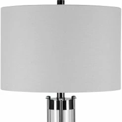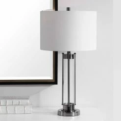 The simple, clean design of Uttermost’s Benjamin 15 in. Table Lamp is enhanced with a light black nickel finish on the details and stacked base. The round hardback shade is a white linen with natural slubbing. Model: W26055-1.