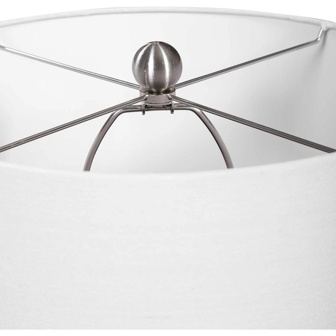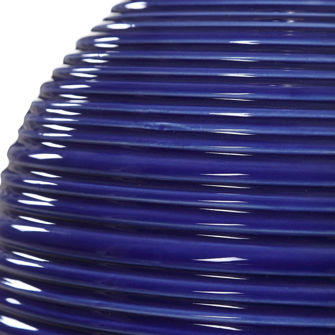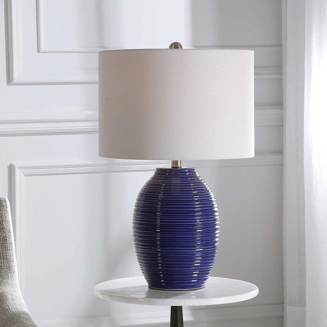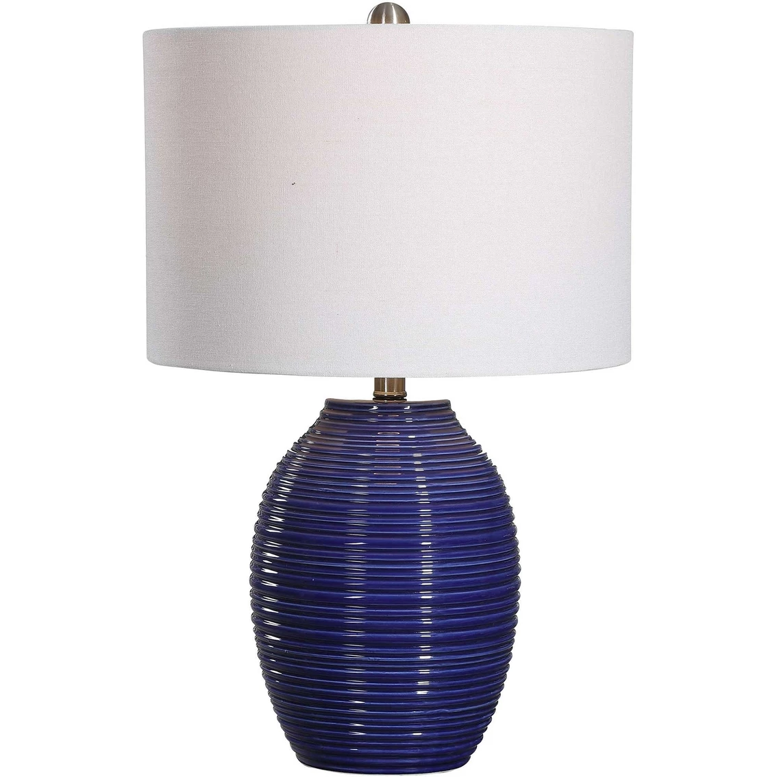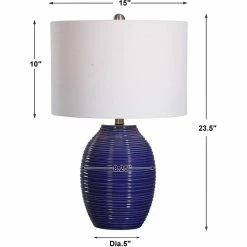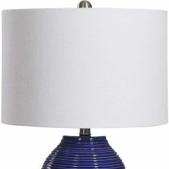 The ribbed texture of this ceramic table lamp from Uttermost is enhanced by the rich indigo blue finish, with light brushed nickel plated accents. The round hardback drum shade is a white linen fabric. Model: W26063-1.