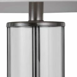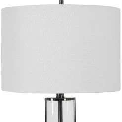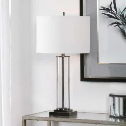 Add some charm to your home decor with this Uttermost table lamp The Lucas table lamp is a glass cylinder design with dark antique nickel accents and offers a clean, simple look. The round hardback shade is an off white linen fabric. Model: W26057-1.
