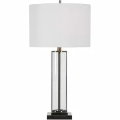 Add some charm to your home decor with this Uttermost table lamp The Lucas table lamp is a glass cylinder design with dark antique nickel accents and offers a clean, simple look. The round hardback shade is an off white linen fabric. Model: W26057-1.