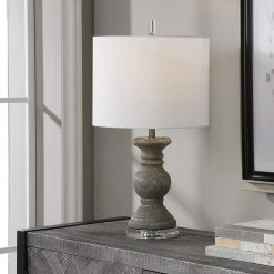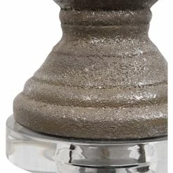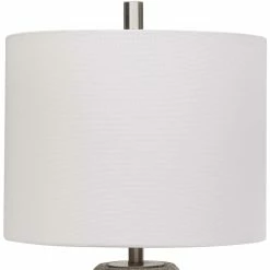 The ceramic Uttermost Mason 13 in. Table Lamp is finished in a textured metallic stone gray with silver highlights and accented with crystal and brushed nickel plated details. Model: W26058-1.