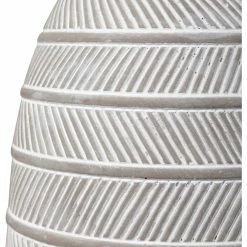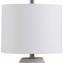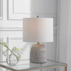 The concrete base of the Uttermost Sophia 13 in. Table Lamp is finished with white etching in an alternating pattern and accented with brushed nickel plated details. The shade is a round hardback drum in a light beige linen fabric. Model: W26064-1.